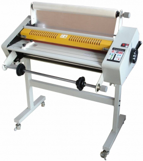 Рулонный ламинатор компактен, удобен в работе для ламинирования полиграфической продукции в малых и средних типографиях. Двухстороннее ламинирование силиконовыми валами внутреннего нагрева. Отключение нижнего вала для одностороннего ламинирования. В комплекте стенд на колёсах. Цифровая регулировка скорости и температуры. LED дисплей. Легкая установка рулонов, длинные стойки для рулонов большой намотки, простая фиксация натяжения плёнки, регулятор сведения валов, автоматическое поддержание режима натяжения плёнки, встроенный ручной резак.