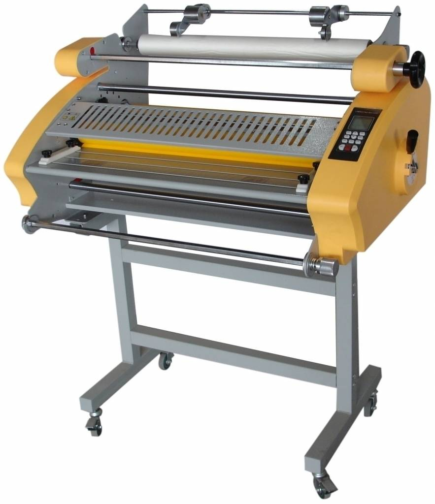 Профессиональный рулонный ламинатор с обрезкой и перфорацией плёнки с рулона, универсален в работе для ламинирования полиграфической продукции различной толщины. Двухстороннее/одностороннее ламинирование силиконовыми валами внутреннего нагрева. Индивидуальная настройка температуры для верхнего и нижнего нагревательного вала вплоть до полного отключения нагрева. ИК датчик контроля температуры. Цифровая регулировка скорости и температуры, программирование памяти на 9 рабочих режимов. Устройство для сматывания бумаги (ревайндер). LCD дисплей. Регулируемое выпрямление листа при одностороннем ламинировании. Режим ожидания. Автоматическое отключение. Реверс. В комплекте стенд на колёсах. Легкая установка рулонов, длинные стойки для рулонов большой намотки, простая фиксация натяжения плёнки, автоматическое поддержание режима натяжения плёнки, ступенчатый регулятор сведения валов под различную толщину материала: (стандарт) 1.5-3-5-6 мм. (картон). Встроенный ручной задний резак.