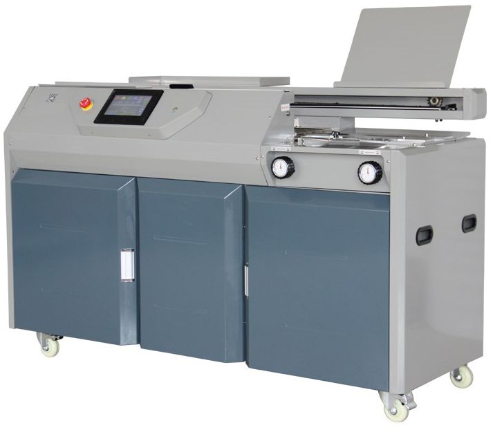 Bulros G65 Автоматическая термоклеевая машина. Толщина переплета: 600 листов. Производительность: 400 книг в час. Максимальная длина блока: 420 мм.